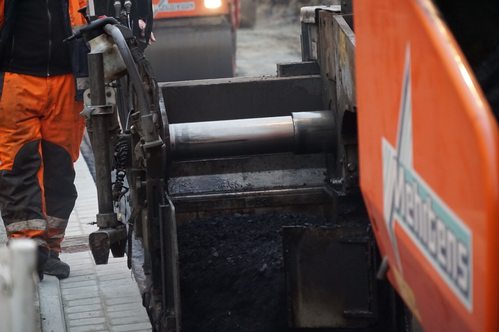 ... und dann mit dem Fertiger höhengenau auf der zukünftigen Fahrbahn eingebaut.