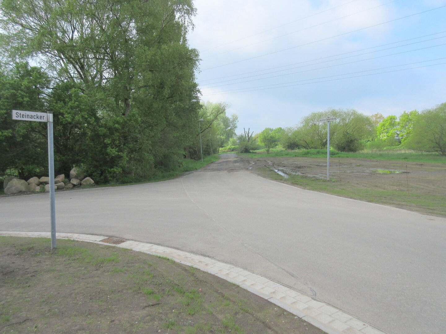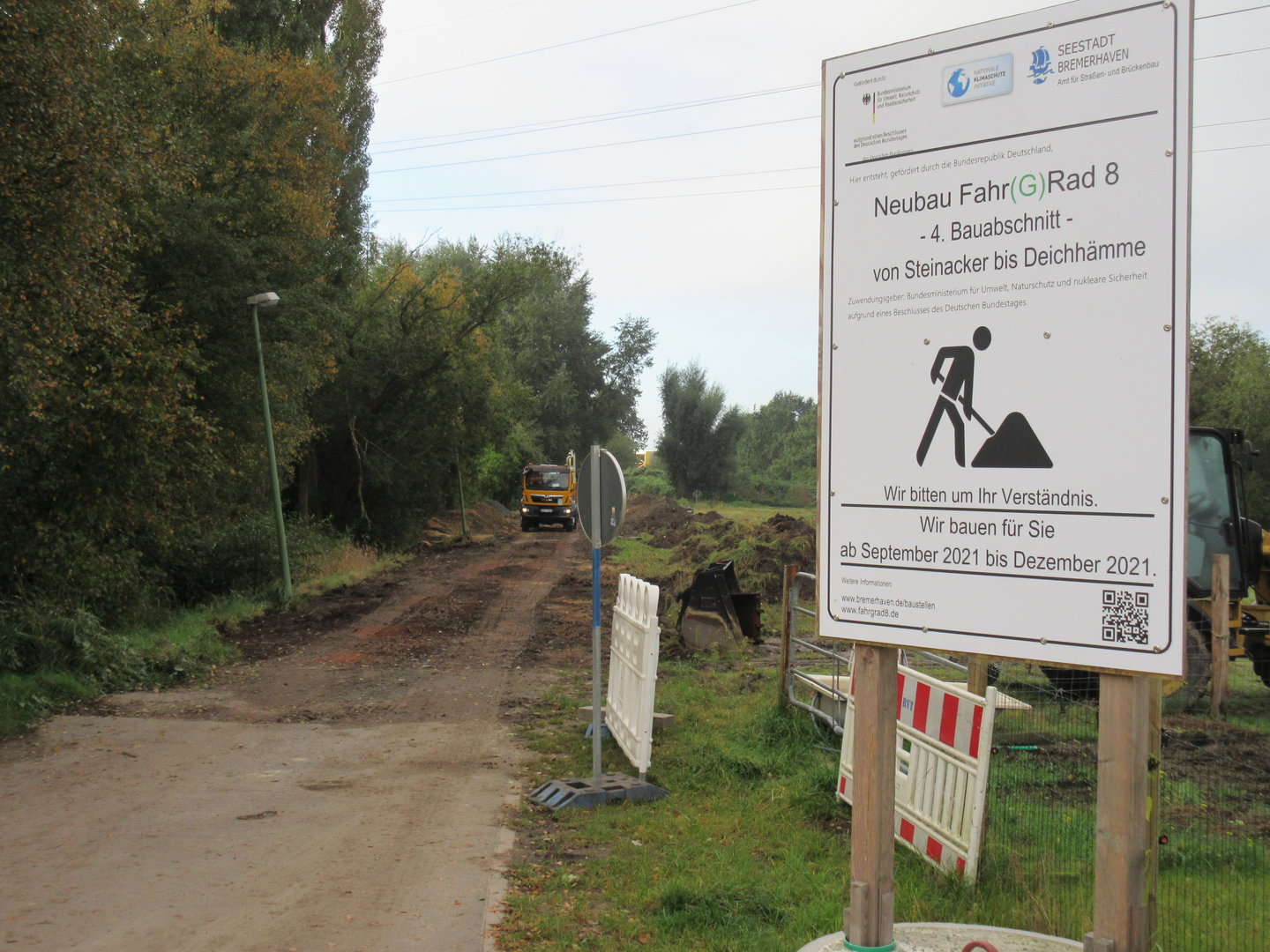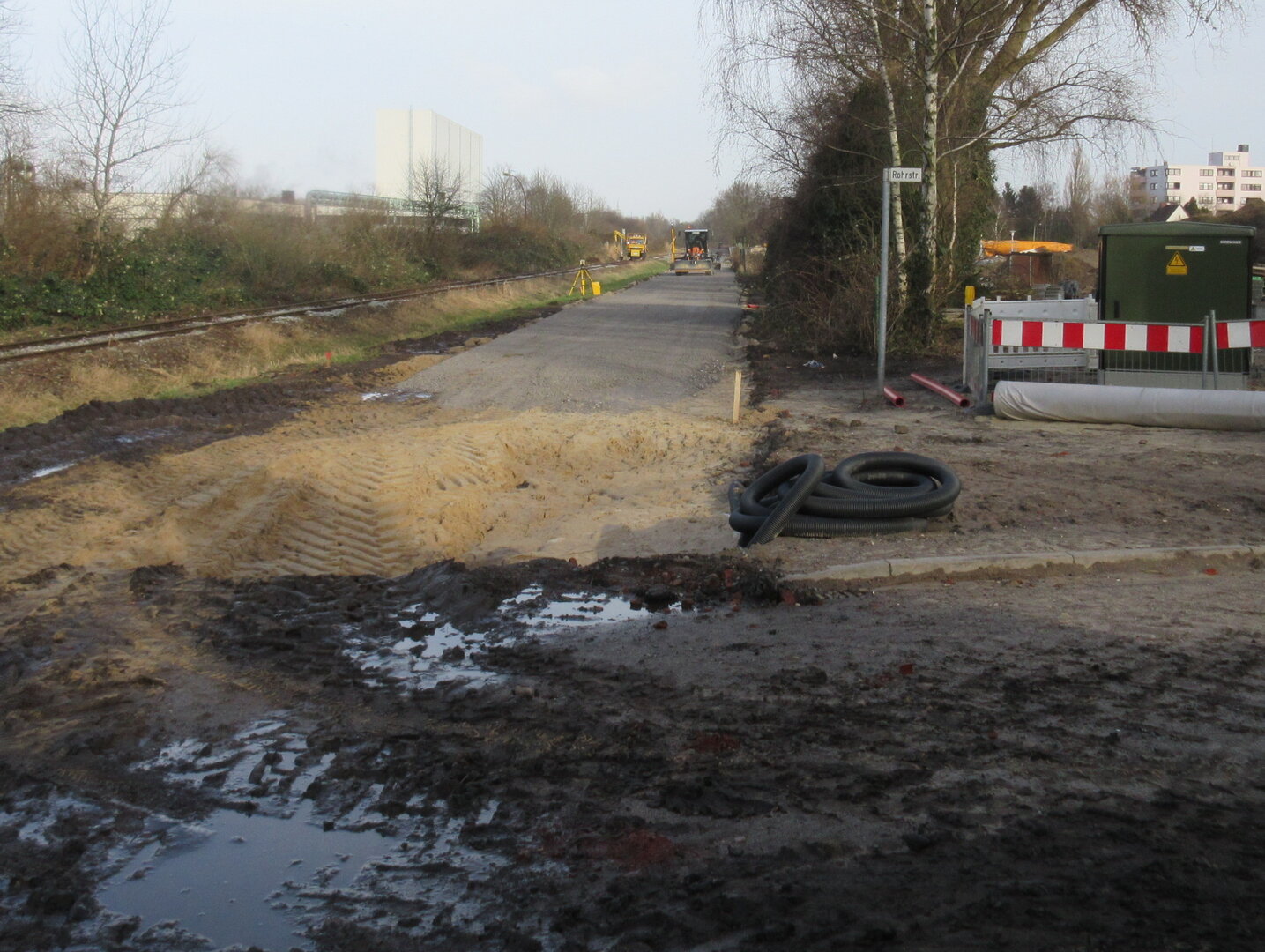 In dem Arbeitsbereich zwischen Hackfahrel 28 und Am Alten Schutzdeich 13 ist die Entwässerung und die Fahrbahn fertiggestellt. Allerdings ist der angekündigte Weiterbau bis zum Steinacker in diesem Jahr nicht mehr zu realisieren.