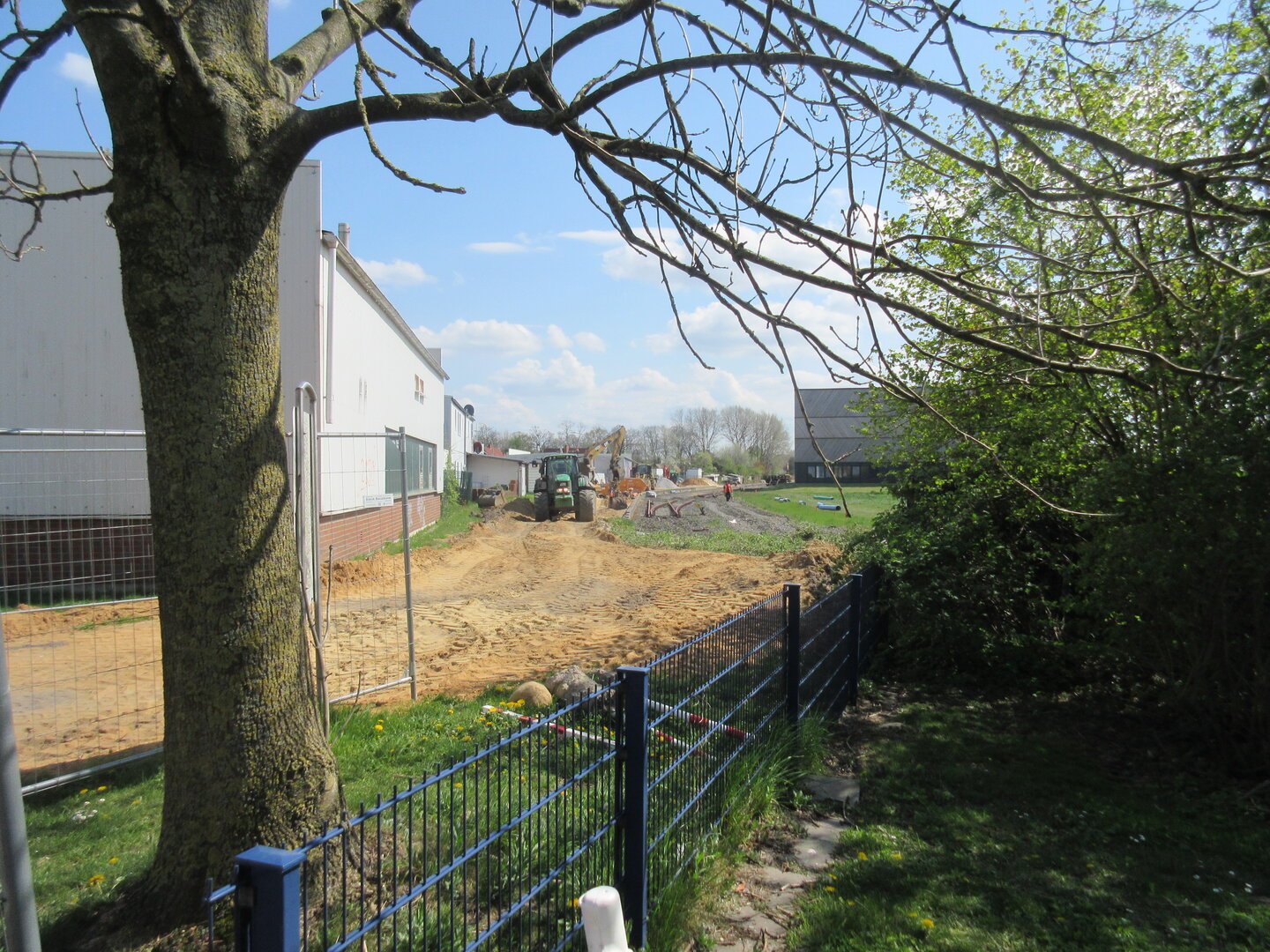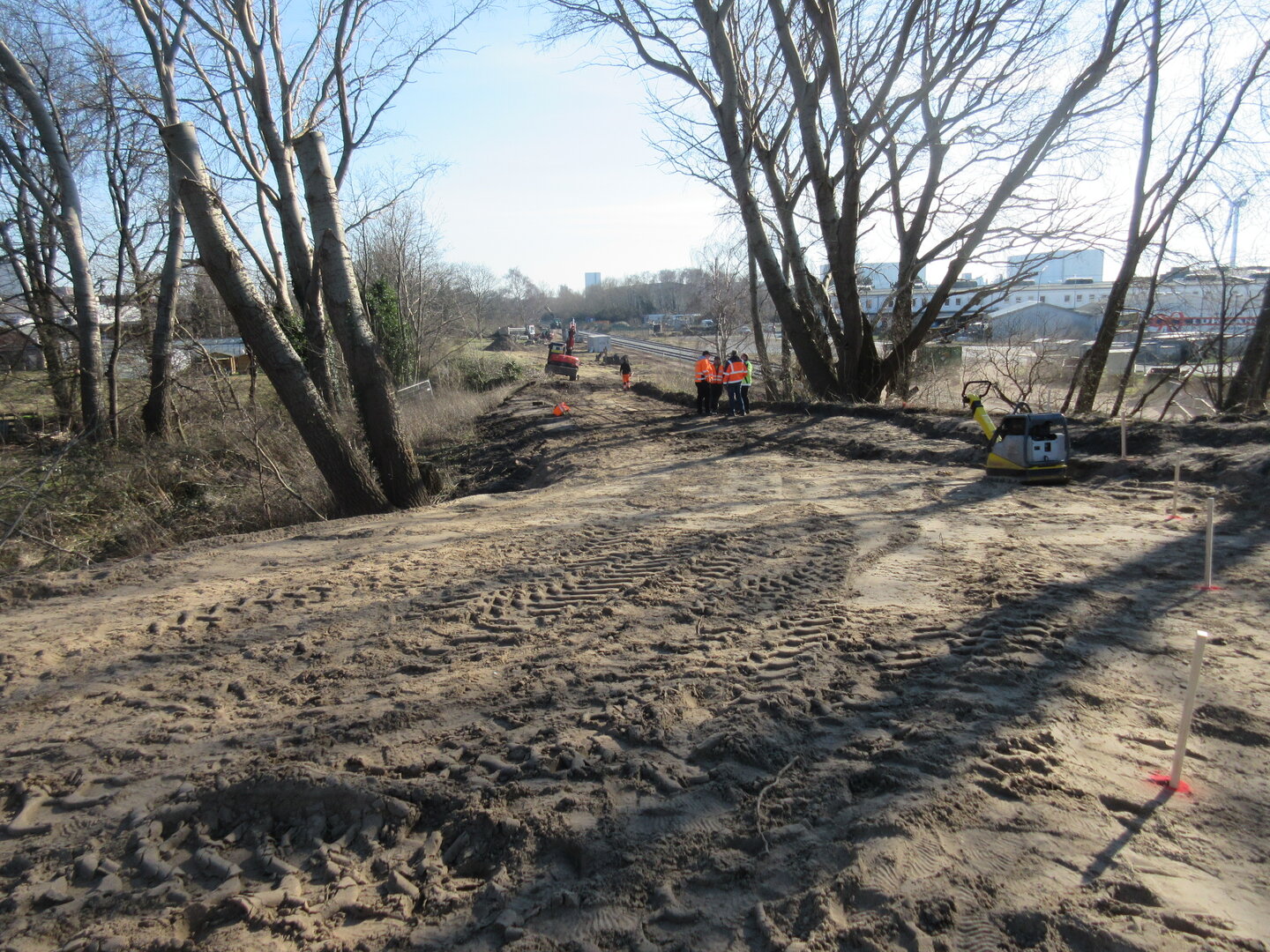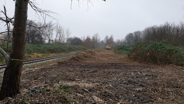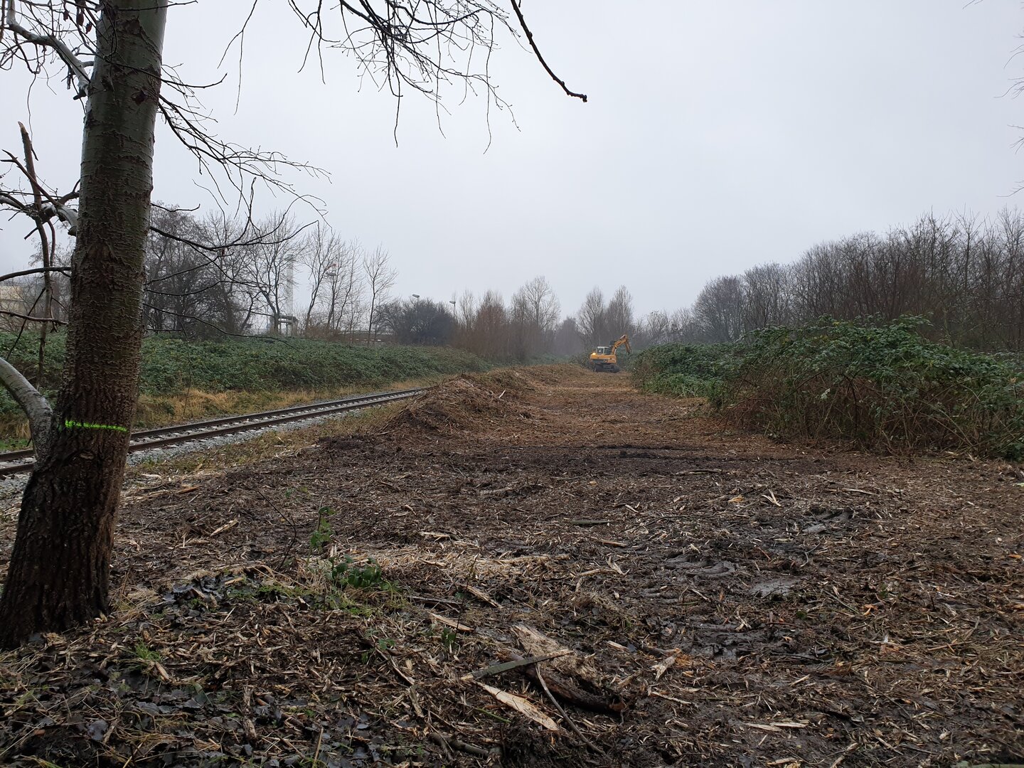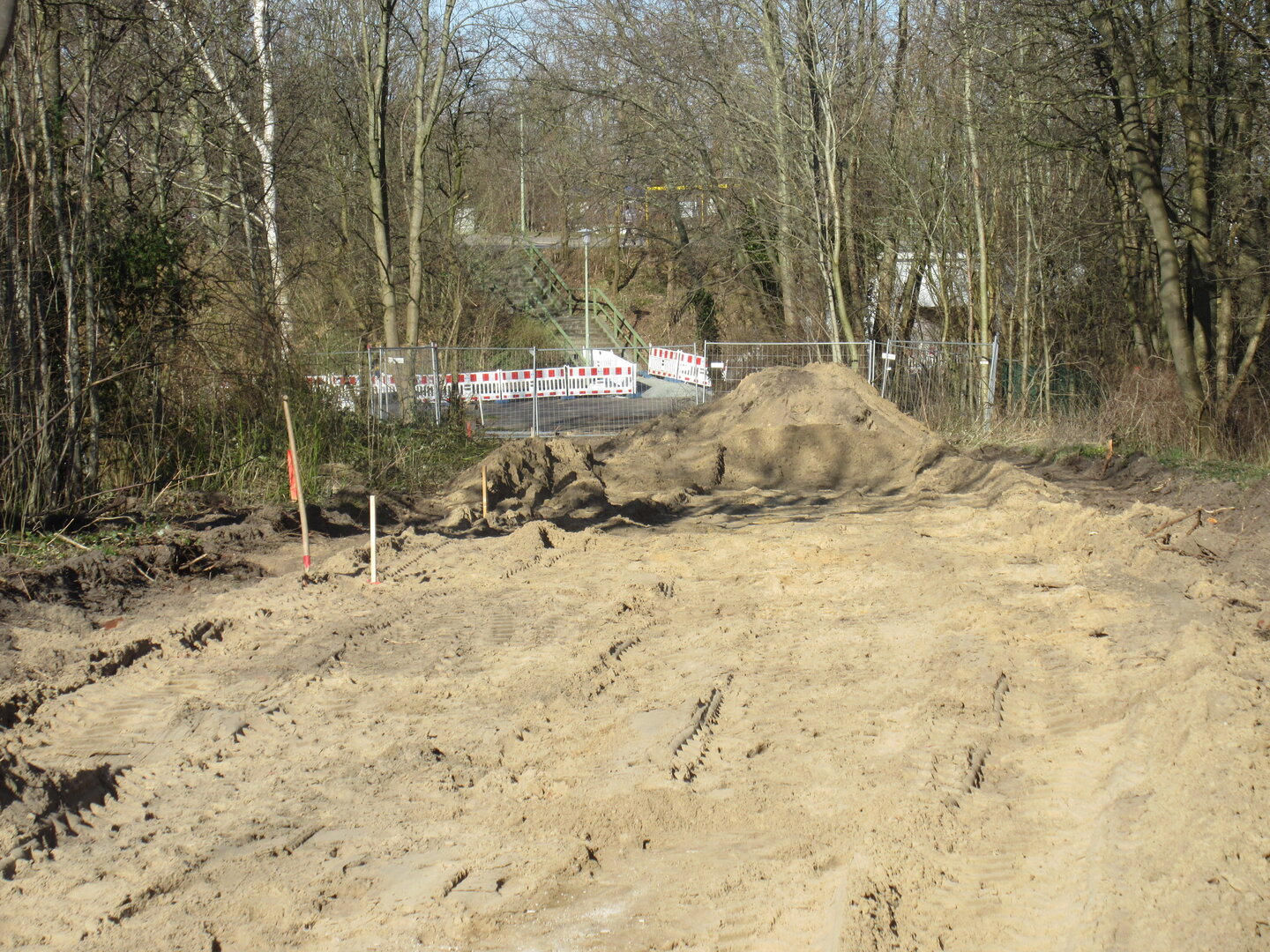 Im Frühjahr 2021 werden die Arbeiten zur Herstellung des Radweges fortgesetzt. Vorab ist die Räumung des sogenannten Baufeldes erforderlich. Zu diesem Zweck müssen alle Büsche, Hecken, Sträucher und Bäume im Trassenverlauf außerhalb der Brut- und Setzzeit entfernt werden. Ein acht Meter breiter Korridor wurde auf diese Weise freigeräumt. Die großen Weiden wurden größtenteils erhalten, die kleineren Bäume hingegen gefällt und das Holz geschreddert. Die entnommenen Bäume werden zu einem späteren Zeitpunkt wieder ersetzt. Fachlich begleitet wurden die Rodungsarbeiten durch das Gartenbauamt und der unteren Naturschutz-/Waldbehörde.