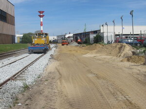 26. April 2022: an der Anschlussstelle Hoebelstraße werden die Erdarbeiten ausgeführt und die Bahnsteigkante der Museumsbahn neu gesetzt.