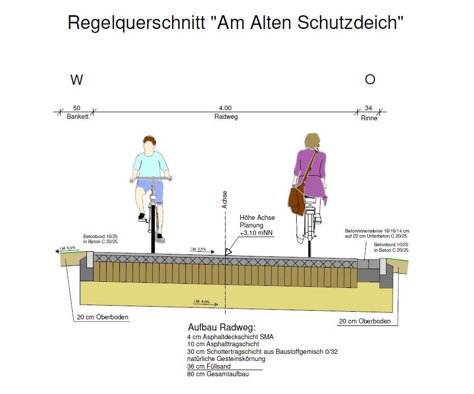 Der dritte Bauabschnitt begann mit der Erneuerung des Schmutzwasserkanals als Begleitmaßnahme der BEG ab Hackfahrel (Hausnummer 28) in Richtung Einmündungsbereich Am Alten Schutzdeich. Im weiteren Straßenverlauf wurde auch der Regenwasserkanal ausgetauscht. Sobald die ersten Kanalrohre verlegt waren, folgten die Straßenbauer und setzten den Weg in Asphaltbauweise grundhaft instand. Den Radfahrern steht dadurch eine Fahrradstraße ("Anlieger frei") mit einer befahrbaren Breite von vier Metern zur Verfügung.Für die technisch versierten Leser zeigen wir nebenstehend den Regelquerschnitt für den Straßenbau. Zusätzlich erhält der Weg noch eine durchgehende Beleuchtung.