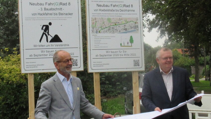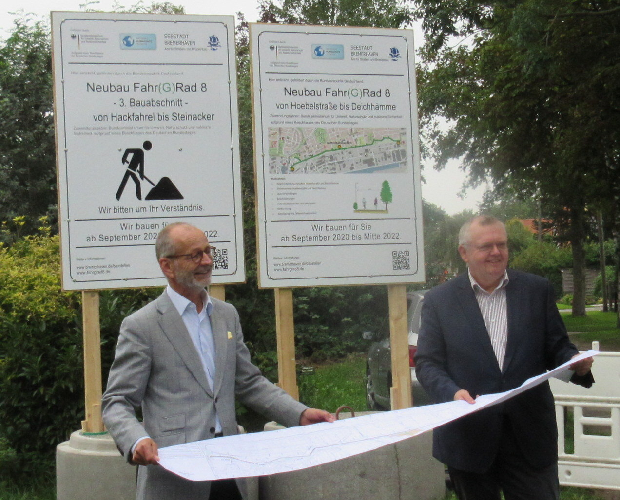 Am 09.09.2020 wurden die Bauschilder für die Gesamtmaßnahme und den 3. Bauabschnitt von Bürgermeister Torsten Neuhoff und Baustadtrat Bernd Schomaker eingeweiht. Gemeinsam gaben sie den Startschuss zum Bau des künftigen Radweges. Beide Dezernenten riefen nochmals eindrucksvoll in Erinnerung, welche Planungsschritte und politischen Beschlüsse auf den Weg gebracht werden mussten, um nunmehr mit den ersten baulichen Umsetzungsschritten zu beginnen.