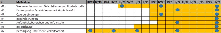 Insgesamt sind sieben Maßnahmen, die zur Durchführung des Projektes essentiell sind, vorgesehen. Sie werden in vier Hauptpunkte zusammengefasst. Die Maßnahmen M1-M3 behandeln den Punkt des Verbindens und Vernetzens. Die Kenntlichmachung des Gebiets in Form von Beschilderung und Beleuchtung erfolgt durch die Umsetzung der Maßnahmen M4 und M6 Die Schaffung von Aufenthaltsbereichen beinhaltet die Maßnahme M5. Unter der Maßnahme M7 werden alle Aspekte zum Thema Informieren und Beteiligen abgedeckt.