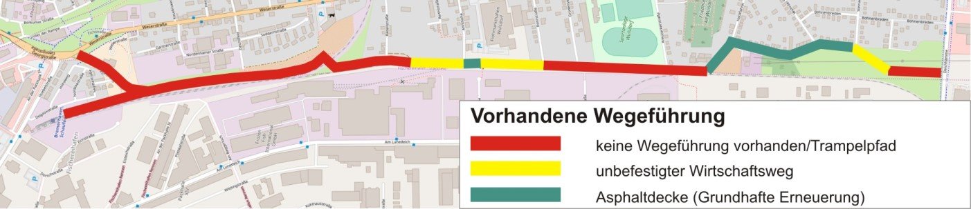 Die derzeit befahrbaren Wegeabschnitte entsprechen weder in Breite noch mit ihrem Belag den Anforderungen, die an einen Radweg zu stellen sind. Selbst die kurzen asphaltierten Strecken befinden sich in einem so schlechten Zustand, dass hier von einer grundhaften Erneuerung auszugehen ist. Der Regelquerschnitt geht von einer Breite von 4,00 m und beidseitigem Bankett von jeweils 0,50 m aus. In bestimmten Abschnitten kann die Breite nicht gehalten werden, weil teilweise nur 2,50 m Breite zur Verfügung stehen. Hier muss mit geeigneten Mitteln eine sichere Begegnungs- und Überholsituation geschaffen werden.Maßnahme 2 - Knotenpunkte Hoebelstraße und Deichhämme