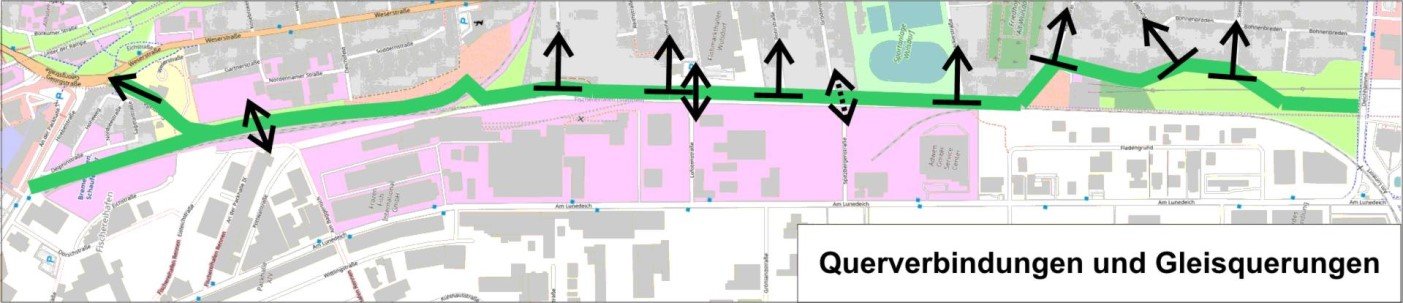 Die Maßnahme zielt auf die Schaffung von Querverbindungen zwischen den angrenzenden Stadtteilen und Quartieren ab. Dazu gehören die bislang aufgrund der Trennwirkung der Bahntrasse fehlenden oder schlecht ausgebauten Verbindungen zwischen den beiden Stadtteilen Wulsdorf und Fischereihafen. Diese grenzen unmittelbar aneinander und besitzen vielfältige Verflechtungen in Form von Arbeits- und Wohnstandorten. Insgesamt sind 11 Anschlüsse bzw. Querungsstellen geplant. Zum Beispiel die Anbindung Georgstraße/ Weserstraße, die Querung Am Baggerloch und die Anbindung der Radellstraße.